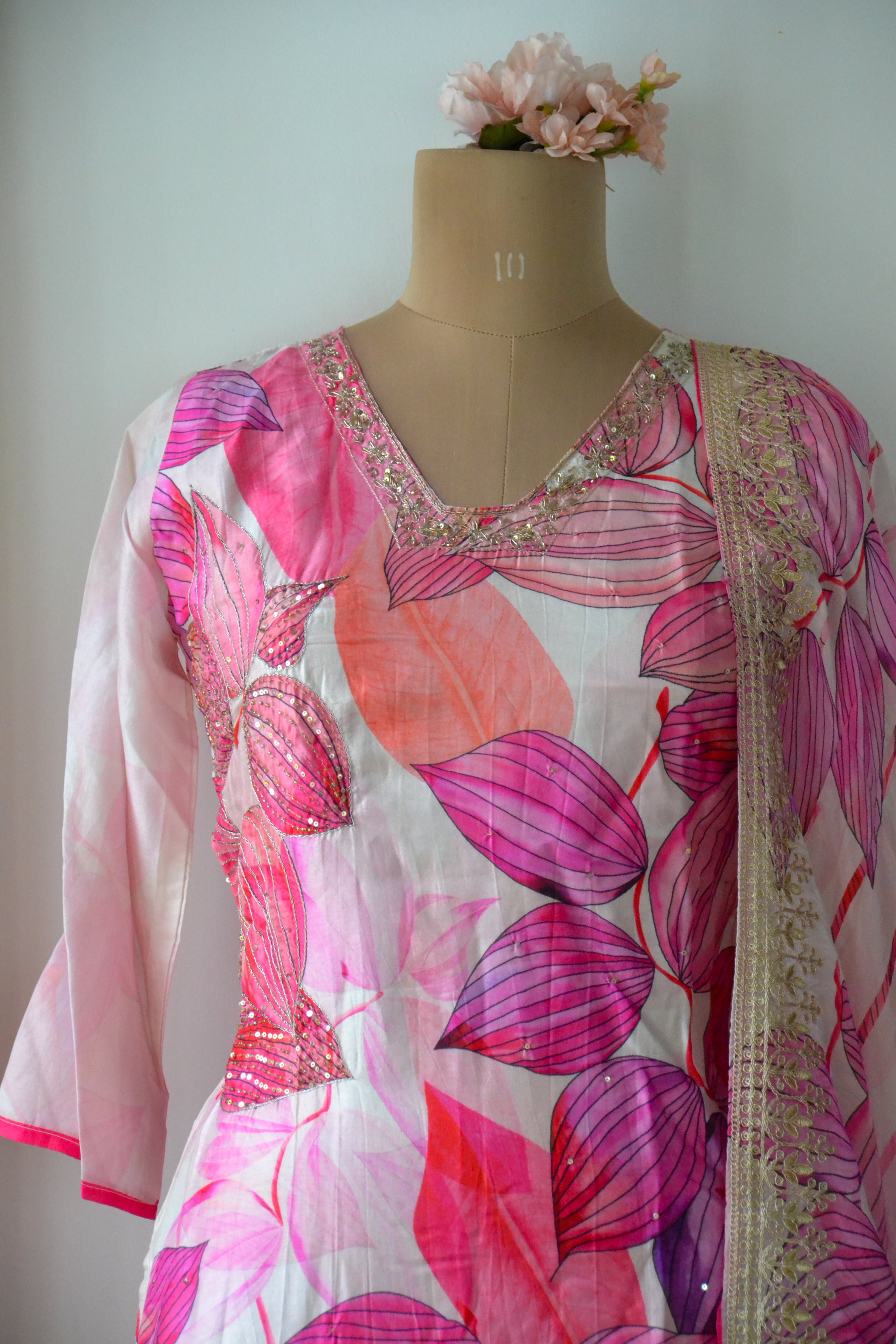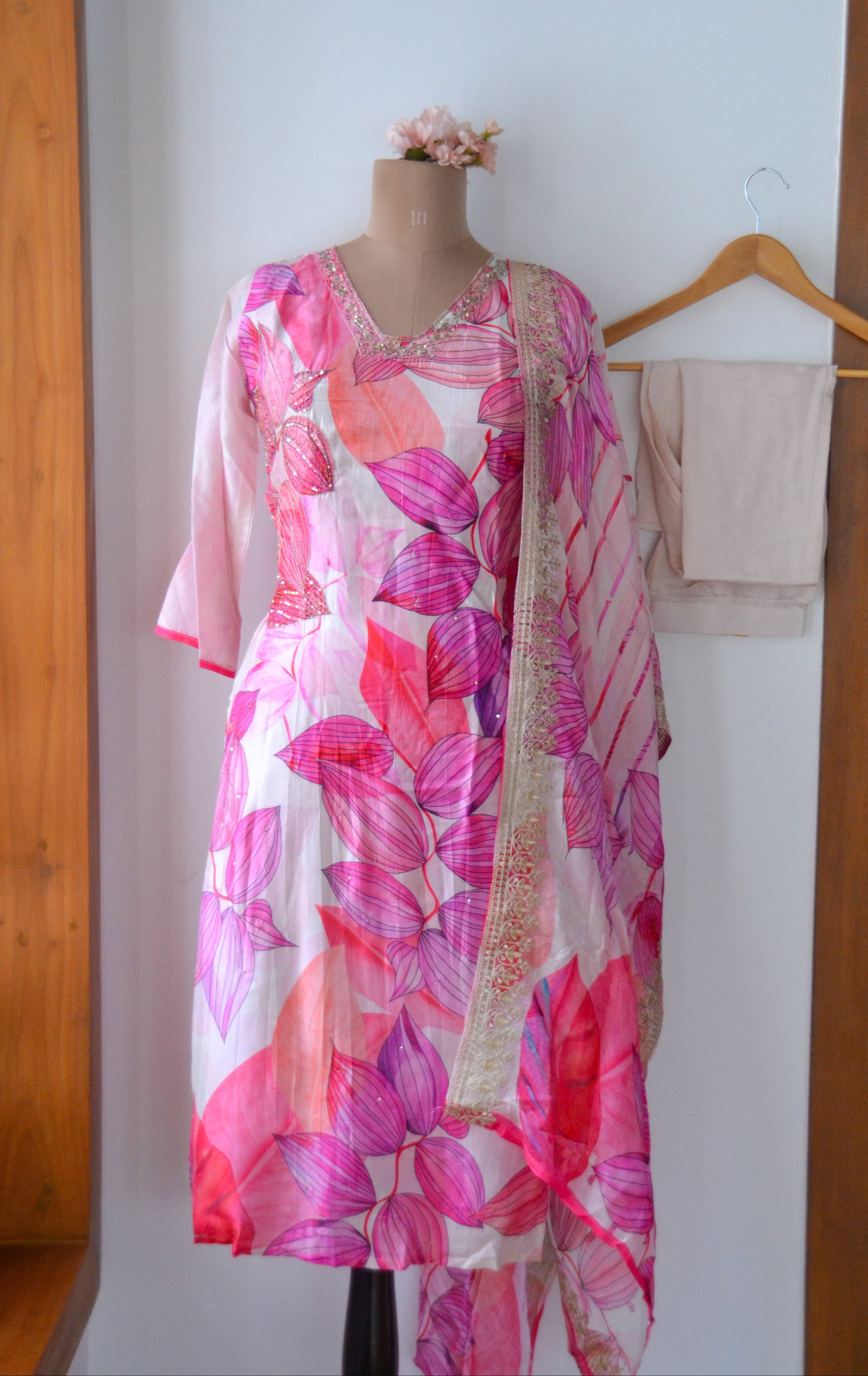 A breezy and vibrant three-piece suit set in soft, flowy muslin silk fabric adorned with a cascade of pink, fuchsia, and coral leaf motifs. The kurta features delicate beadwork along the neckline, perfectly paired with a striped dupatta finished with intricate golden lace borders. Comes with a solid-toned bottom for a balanced and graceful look, making it ideal for sunny day outings or festive brunches.