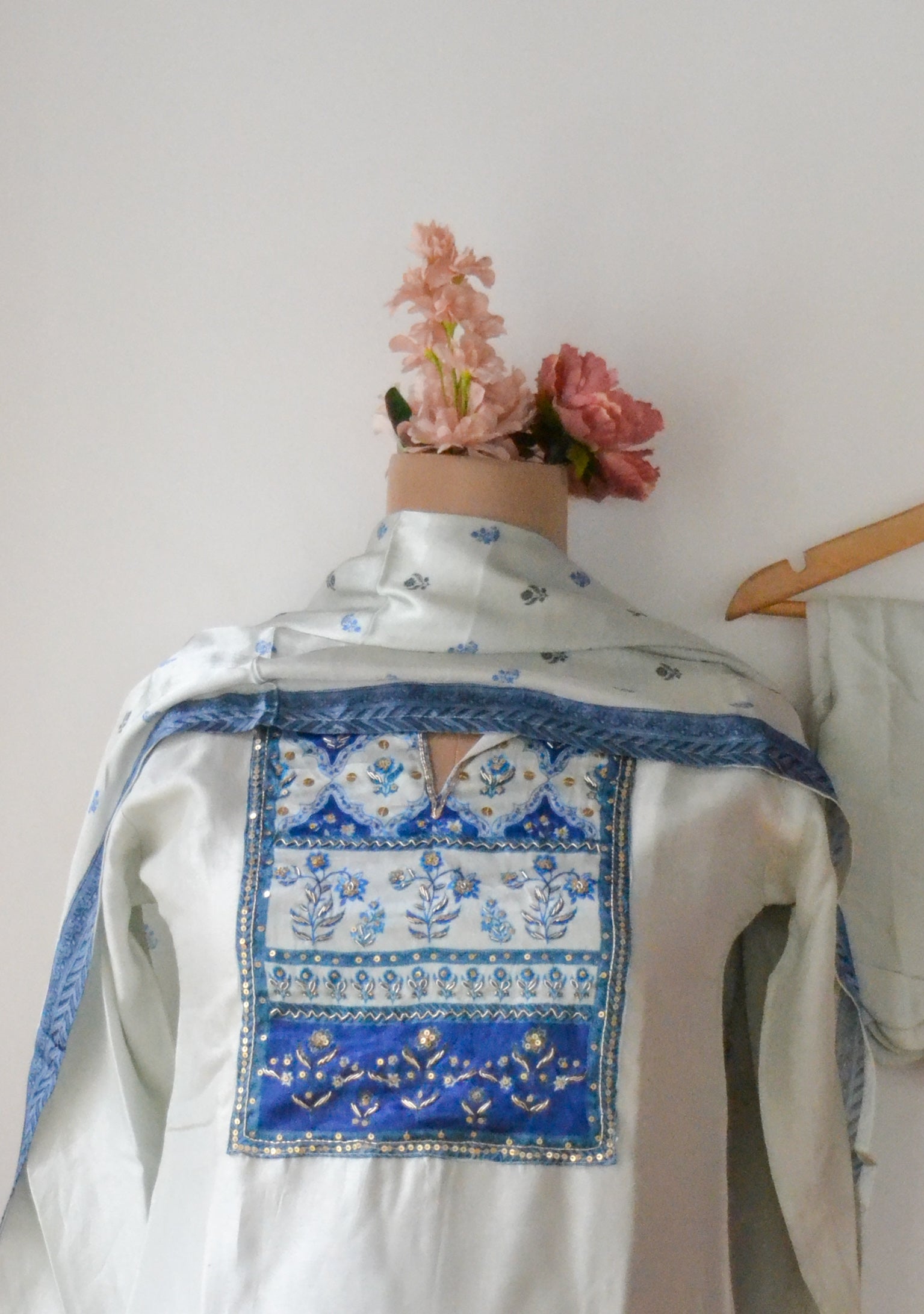 A serene pastel-hued suit set adorned with intricate blue floral embroidery on the yoke, framed by delicate bead detailing. Paired with a matching dupatta featuring subtle printed accents and scallop-hem trousers, this ensemble blends minimal sophistication with timeless ethnic charm — perfect for casual elegance or festive gatherings.