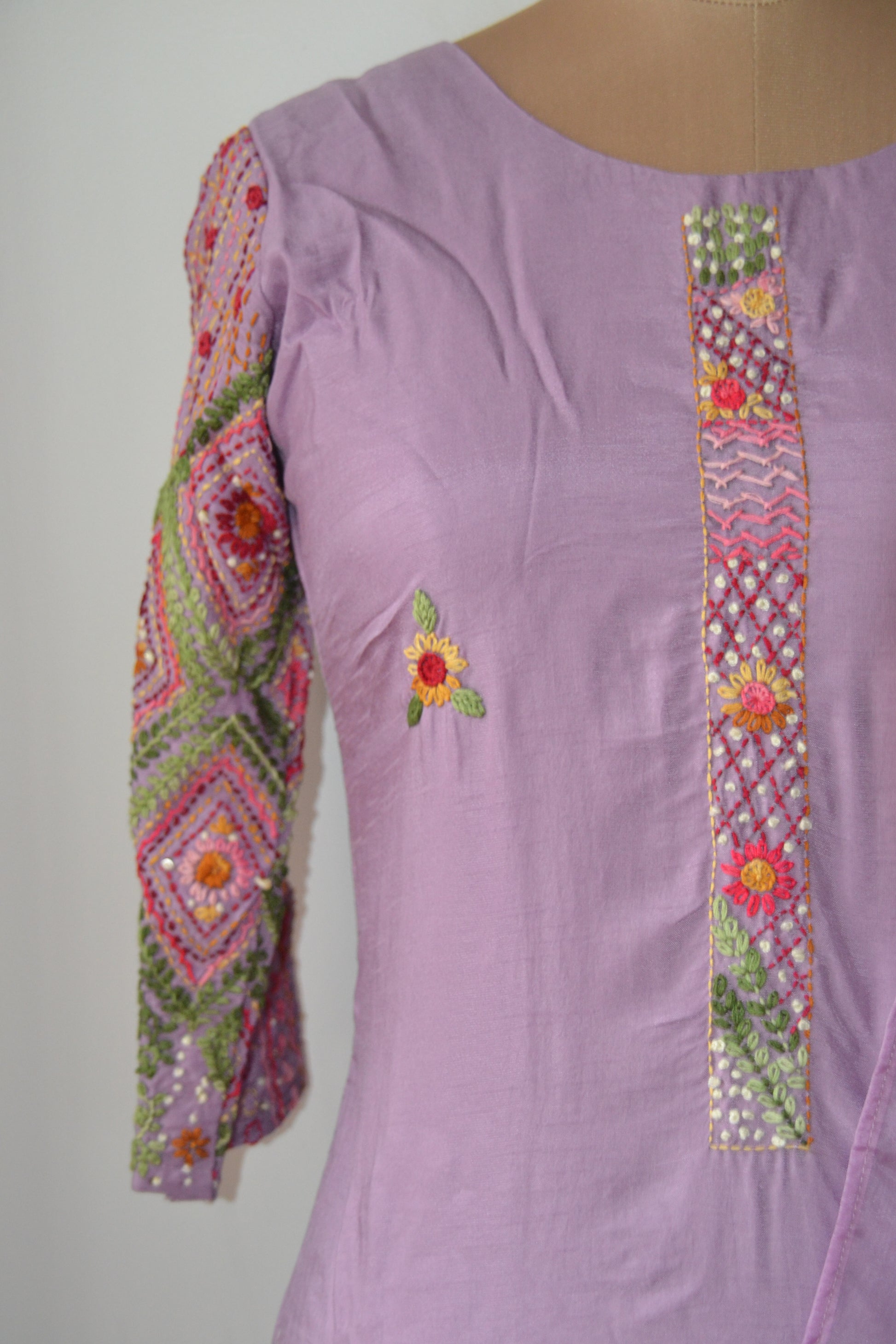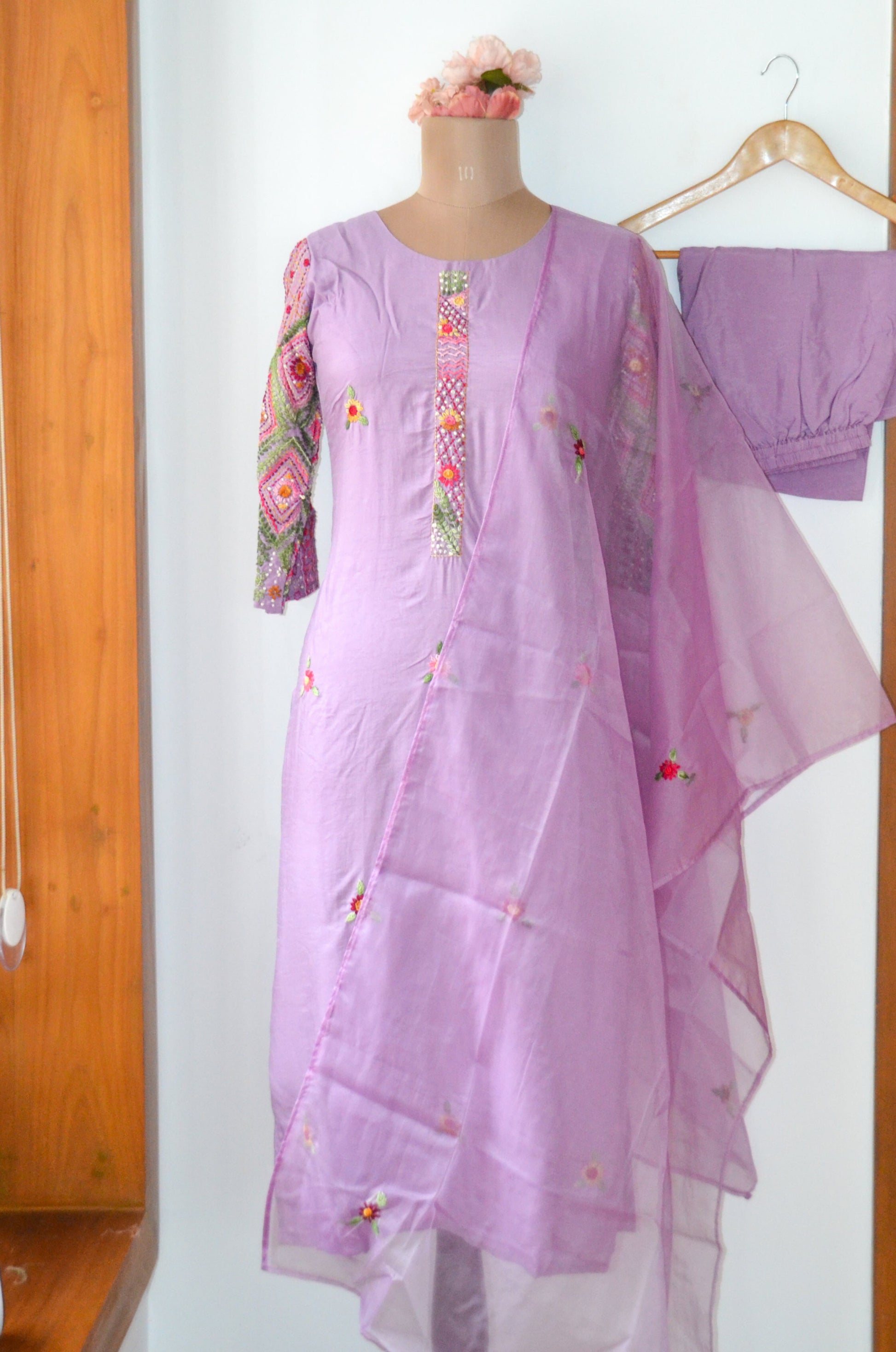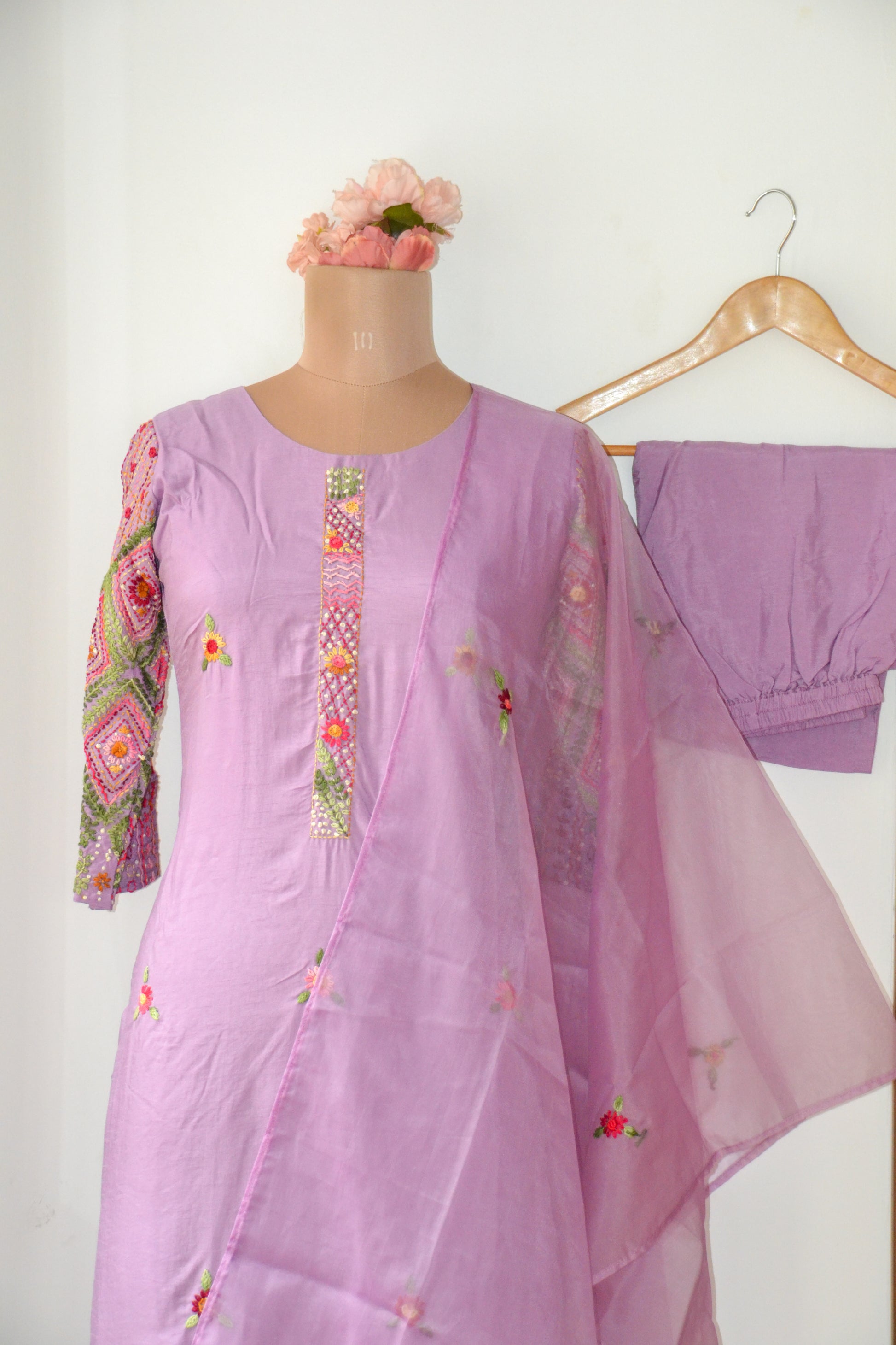 A graceful lavender muslin set that blooms with delicate charm. The kurta features intricate hand embroidery along the placket and floral bursts across the body, while the sleeves steal the show with vibrant, geometric threadwork in shades of pink, green, and yellow. Paired with a organza matching dupatta scattered with dainty blossoms and bottom , this ensemble blends subtle elegance with artisanal detailing — perfect for adding a poetic touch to your festive and casual days.